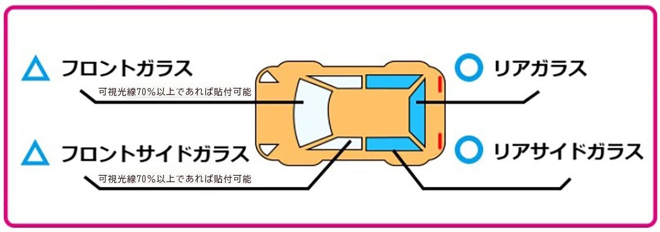 自動車窓ガラスは走行時の安全性を確保するため、 フロントガラス、およびフロントサイド (運転席・助手席側面) ガラスにフィ ルムを貼る場合、フィルムを貼った状態でその可視光線透過率が70%以上でなくてはならないと 「道路輸送車両の保安基準」に より定められています。 自動車の車種によって窓ガラスの可視光線透過率が異なりますので、必ず施工時、車検時に可視光線透過 率測定器で、計測してください。 詳しくは施工店にお尋ねください。