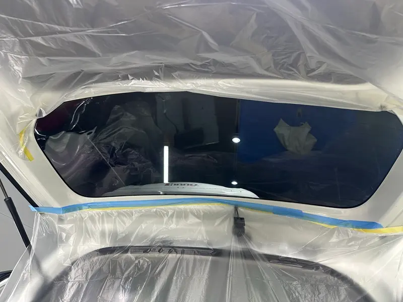 リアガラスは「一枚貼り」で施工いたします。リアガラスは大きく湾曲しているため、フィルムを一枚で貼るには高度な技術と豊富な経験が必要です。そのため、多くの量販店やディーラーでは施工が難しく、電熱線の中央あたりで上下に分割した「二枚貼り」を採用することがあります。しかし、この方法では時間の経過とともに、分割部分が電熱線の熱で縮み、隙間が生じてしまうことがあります。当店では熟練の職人が施工を行うため、ほとんどの車種で一枚貼りが可能です。継ぎ目のない、美しく自然な仕上がりをご提供いたします。