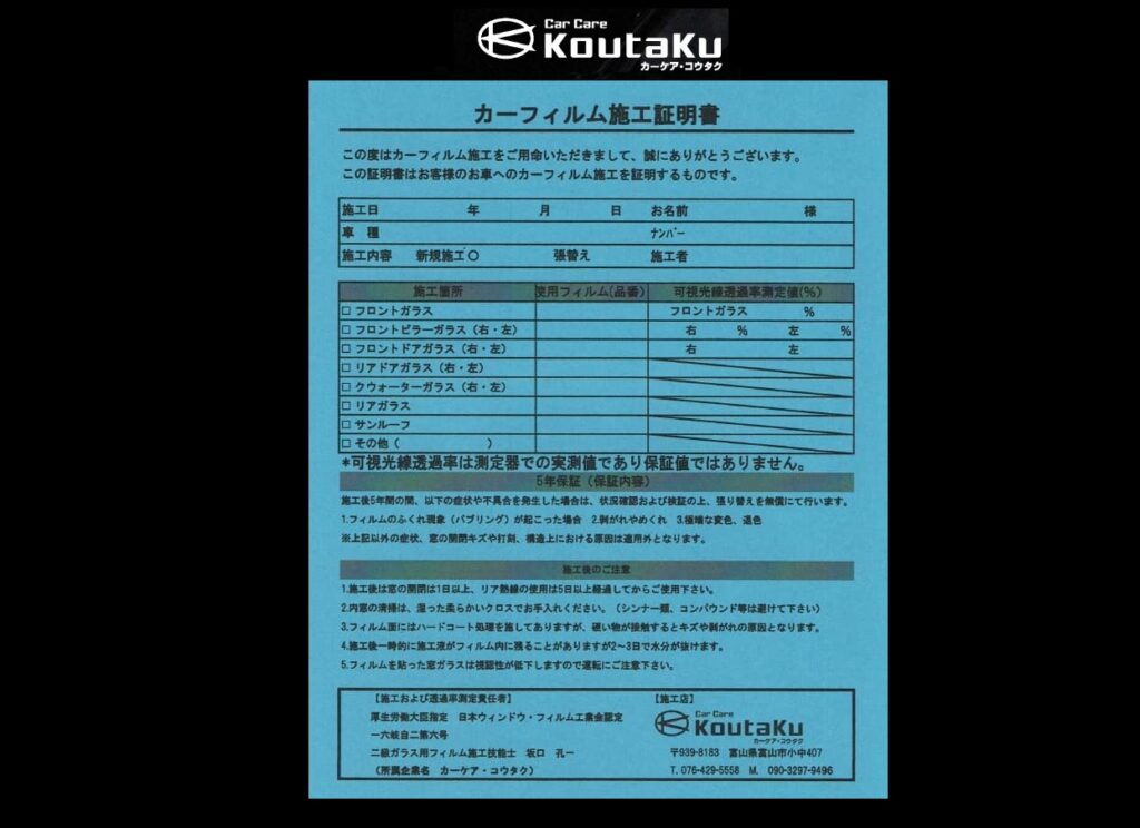 カーフィルム施工後に、5年保証付きの「カーフィルム施工証明書」を発行します。施工後5年の間に、極端な変色、退色、はがれ、浮き等の症状が確認された場合、「カーフィルム施工証明書」をご提示頂ければ、無料で再施工させて頂きます。この保証を付けられるのは、トラフィックの技術に対する絶対的な自信の裏打ち、そして私共が最大の努力を怠らない為の戒めになるという理由からです。